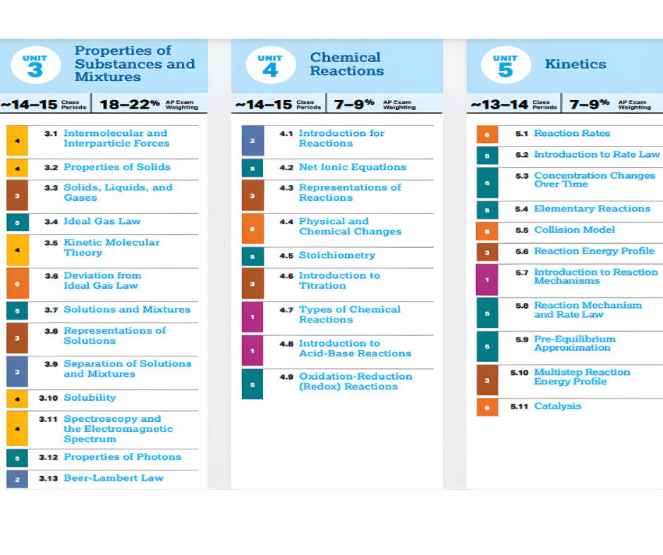 The AP Chemistry syllabus 2025 is divide into nine units, each focus on specific topics in chemistry. Below is an outline of the units and their respective exam weightings.